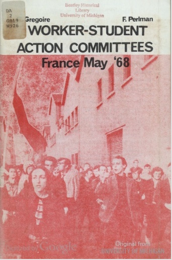 The front and back covers of the Black and Red pamphlet Worker-Student Action Committees: France, May ’68 by Roger Gregoire and Fredy Perlman are now visible in the HathiTrust Digital Library. Full a longer comment on the text, see the post below. Previously, the scanned image began with the table of contents.